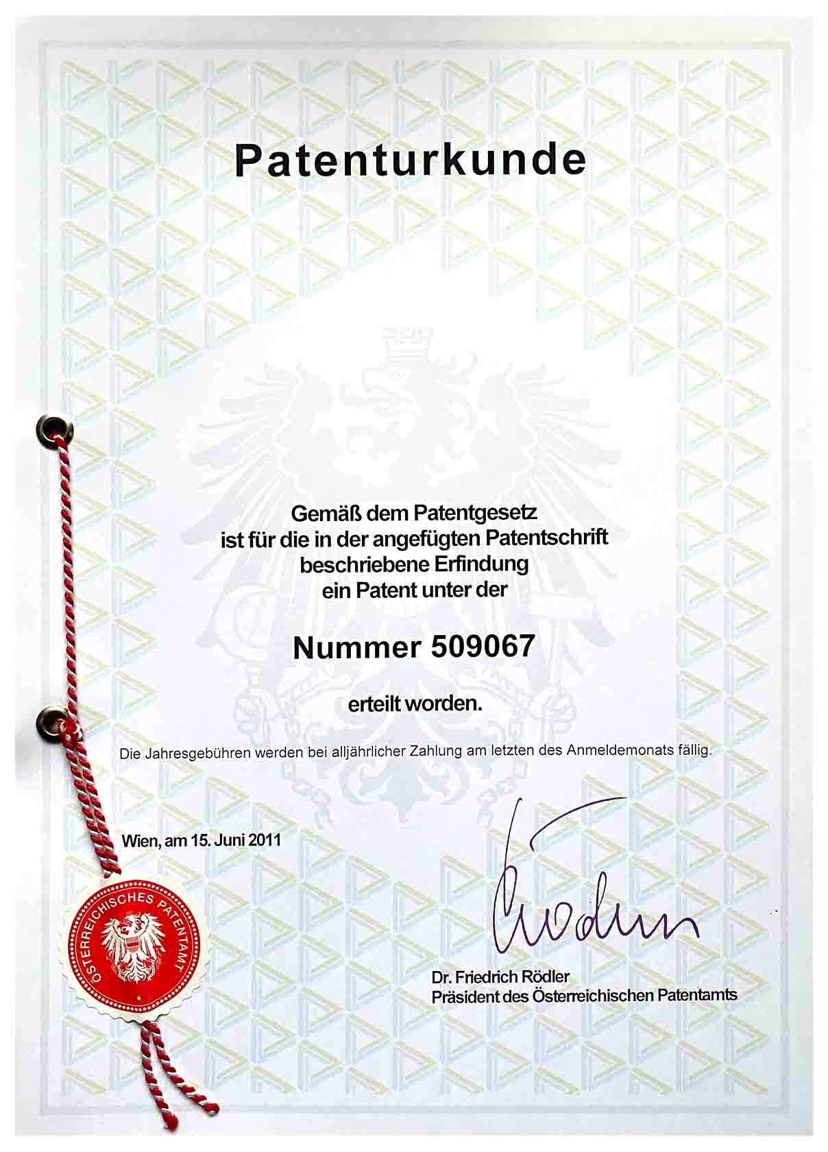 Patent Certificate No. 509067, Austrian Patent Office, Vienna, 15 June 2011 — the only patent for thermoplastic fine art in the world.