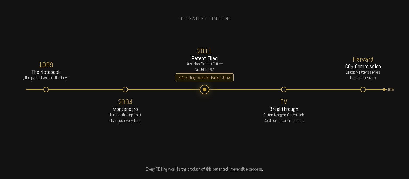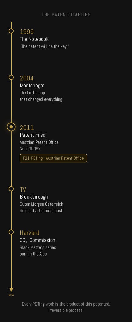 Every PETing work is the product of a documented, patented, irreversible process. To own one is not merely to own an object — it is to own a singular act of transmutation.